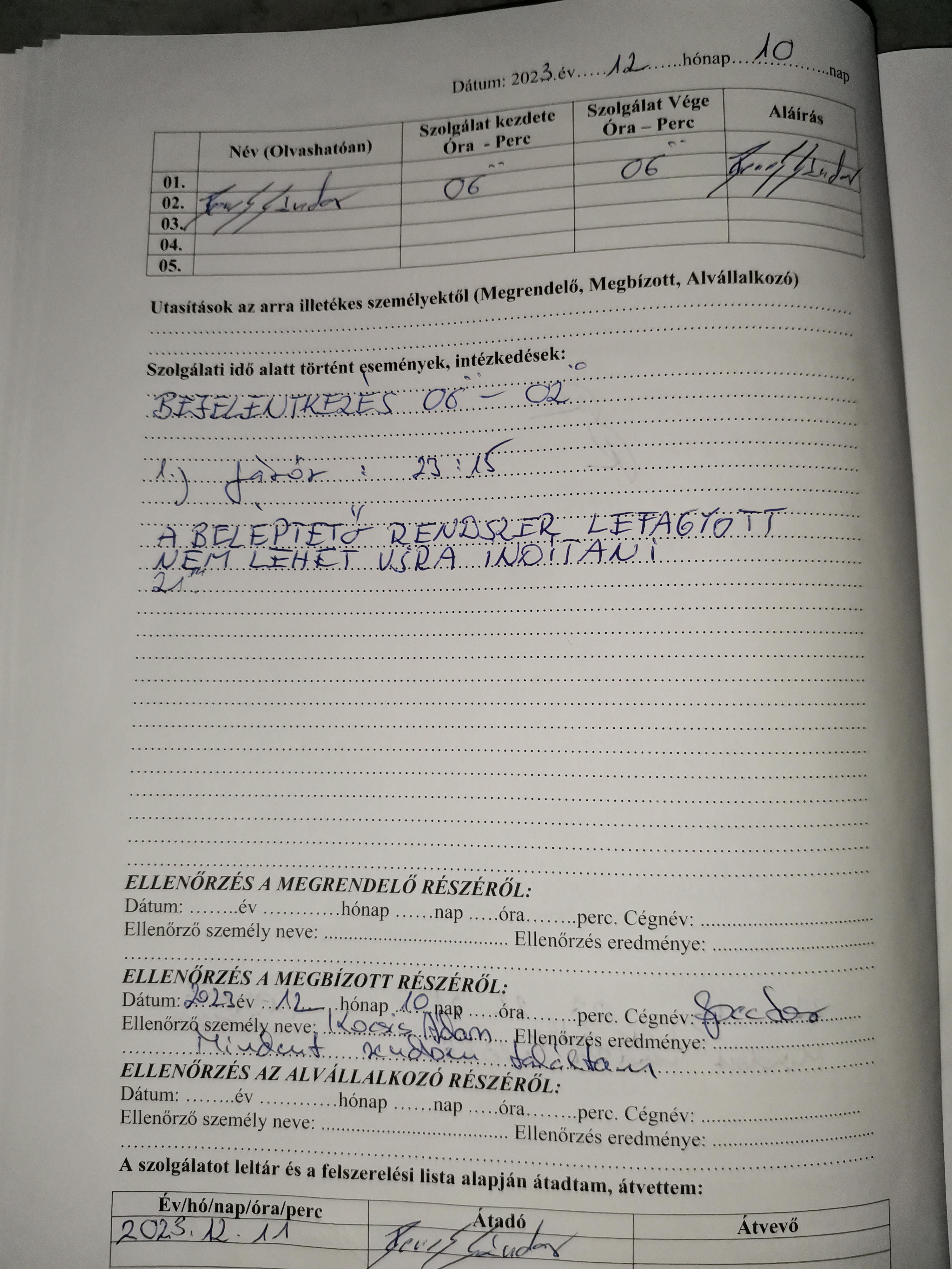 | Felszerelés nemmegfelelősége | A beléptető rendszer szoftveres hiba miatt nem üzemel 21.30-tól. A program újraindítás után sem működik. Hiba naplózva. |