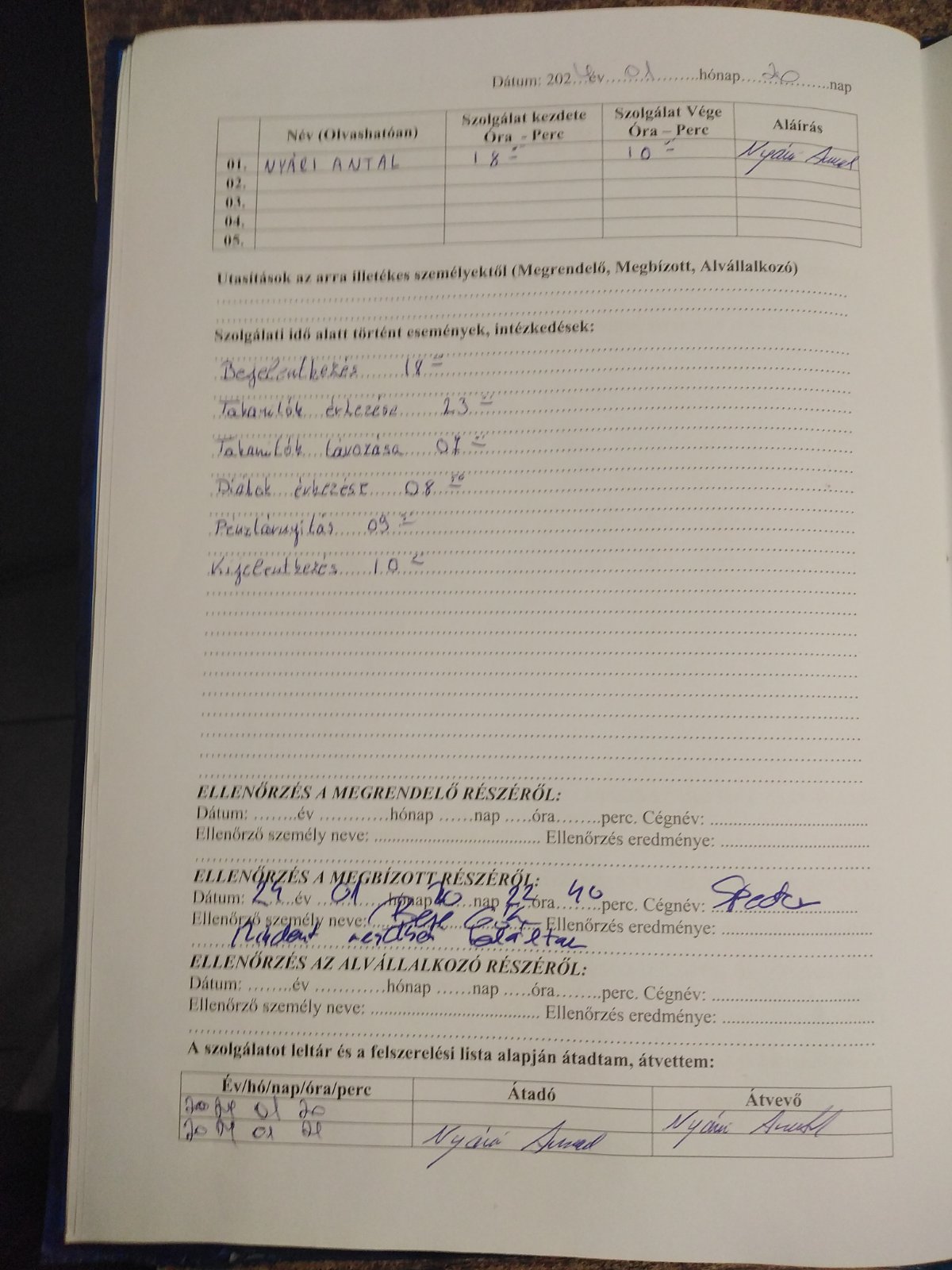 | Az őrzési helyre kiadott munkaeszközök megléte | Megfelel |