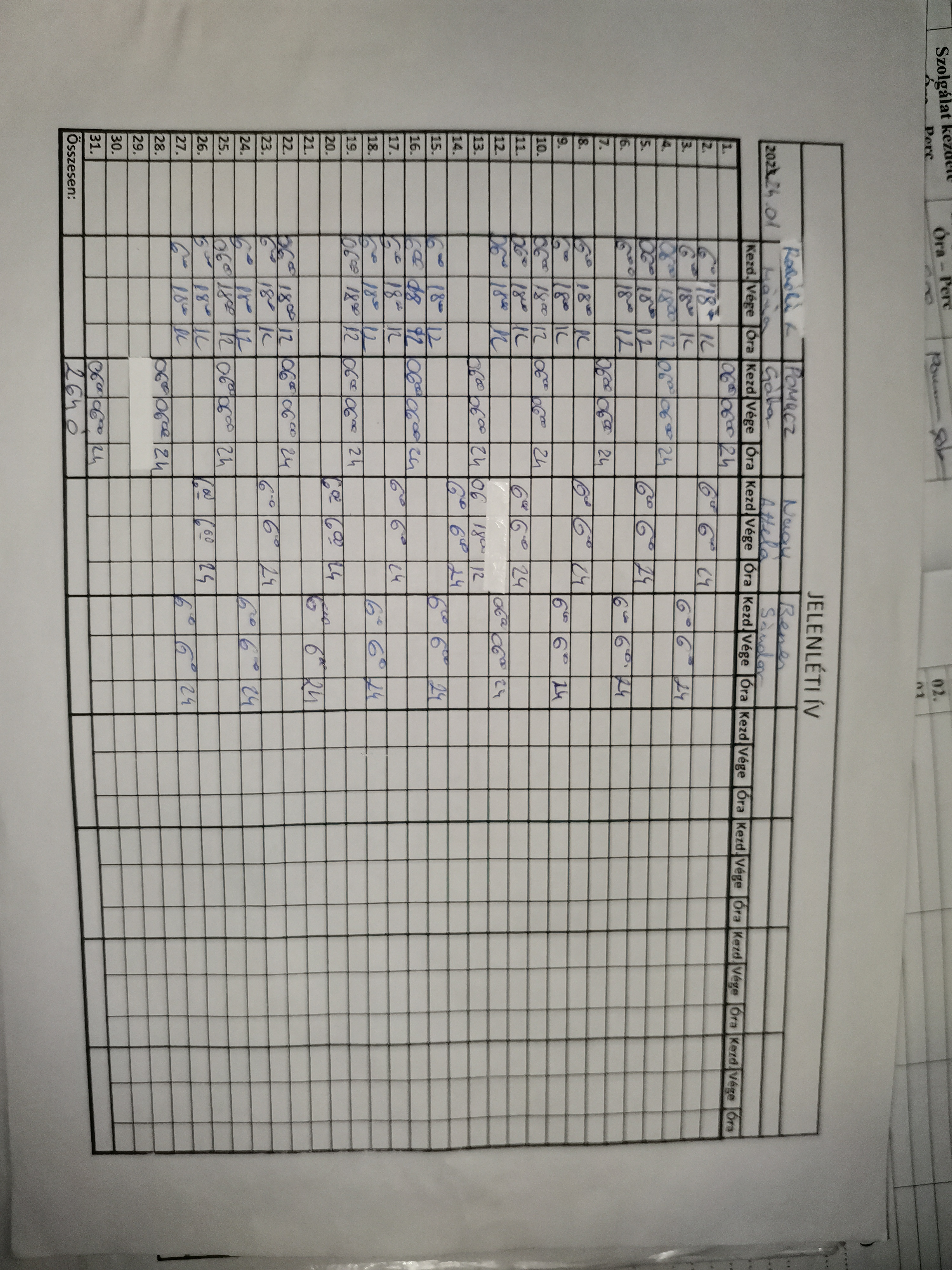 | Szolgálati okmányok nemmegfelelősége | Hó végi zárás miatt előre kitöltött jelenléti ív. |