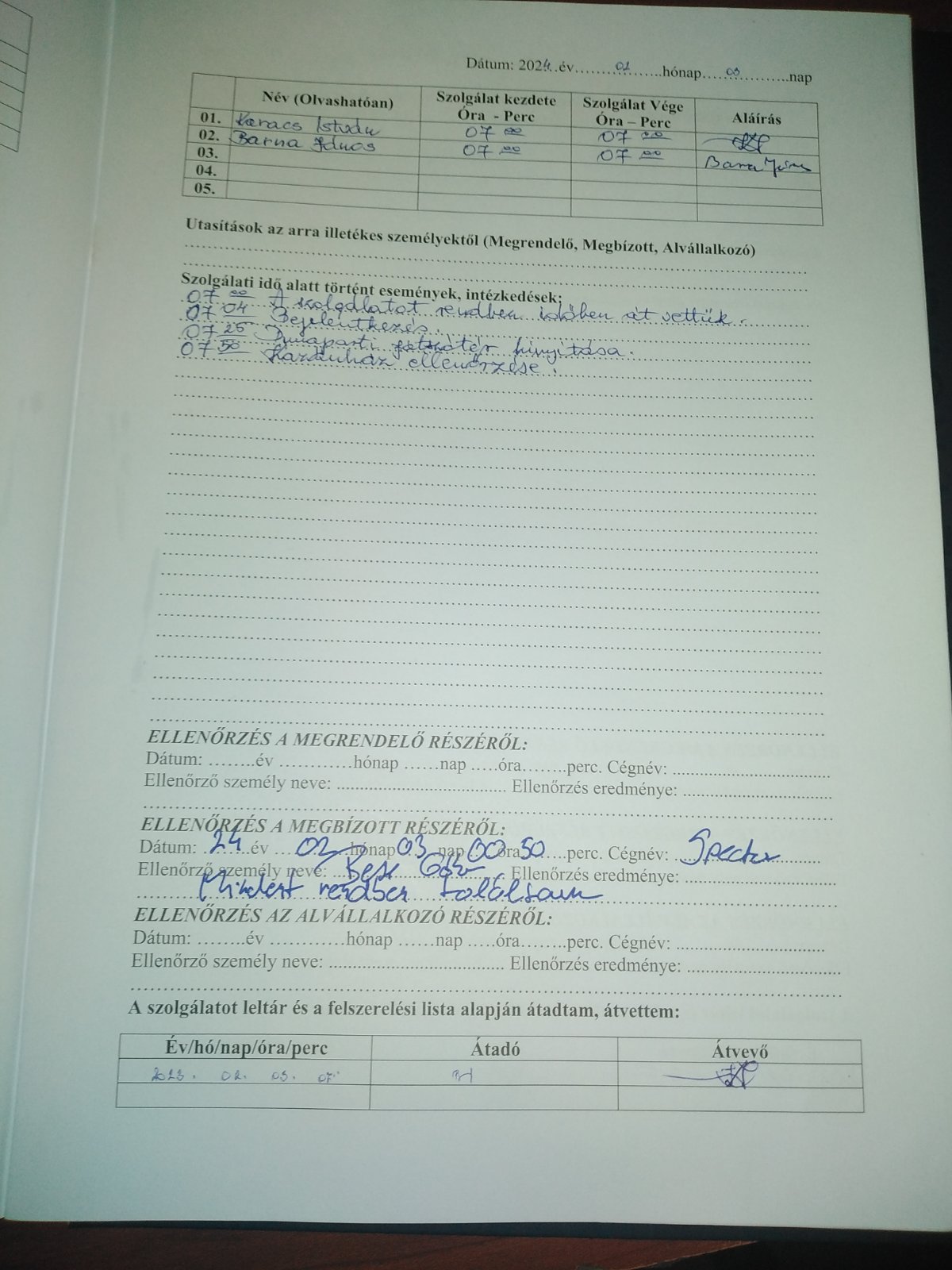 | Az őrzési helyre kiadott munkaeszközök megléte | Megfelel |