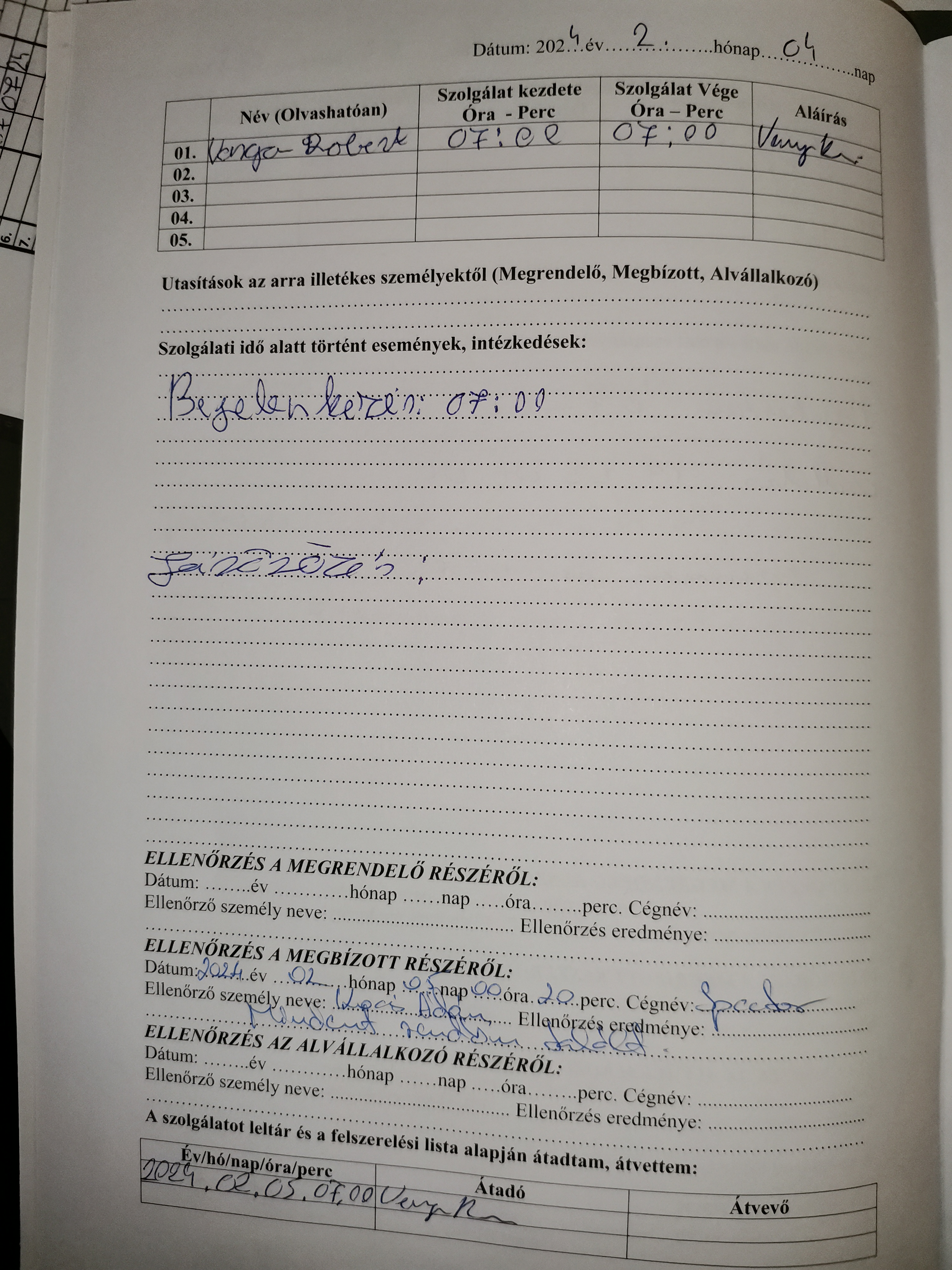 | Az őrzési helyre kiadott munkaeszközök megléte | Megfelel |
