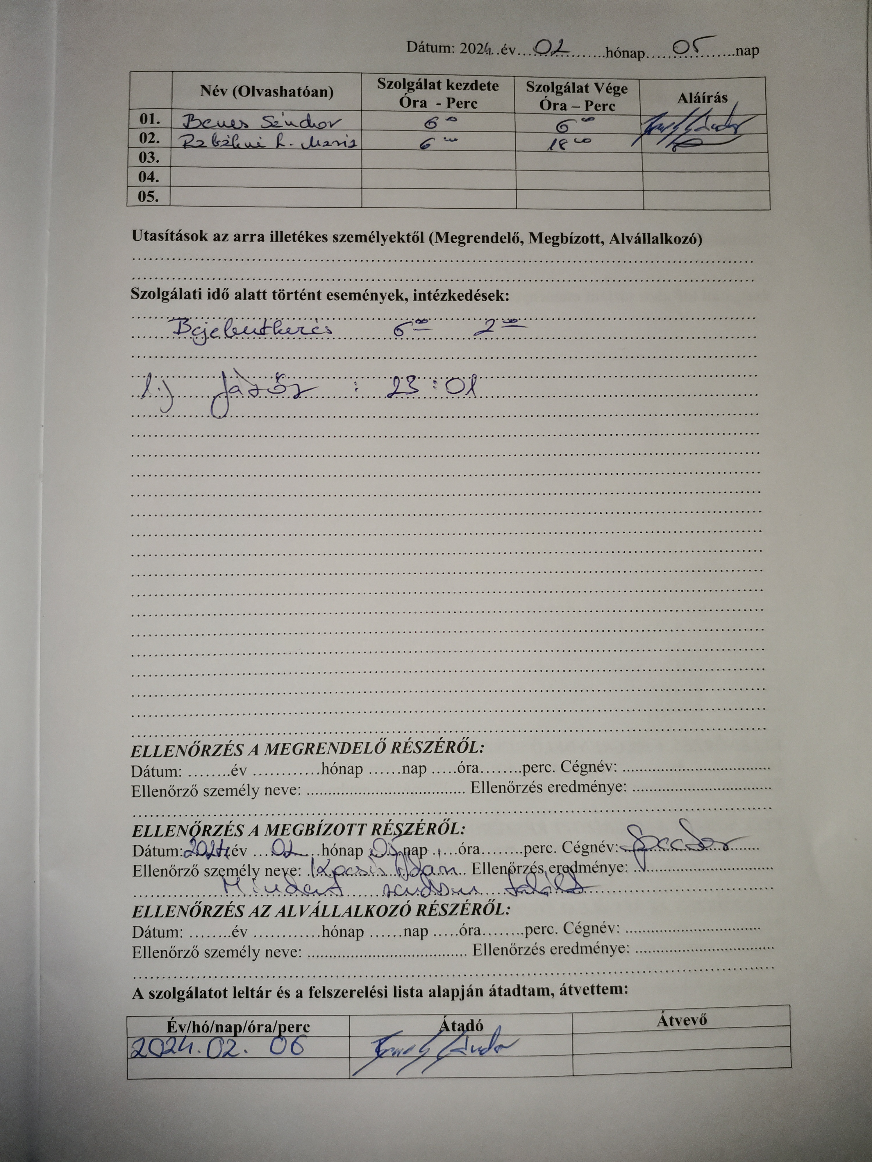 | Az őrzési helyre kiadott munkaeszközök megléte | Megfelel |