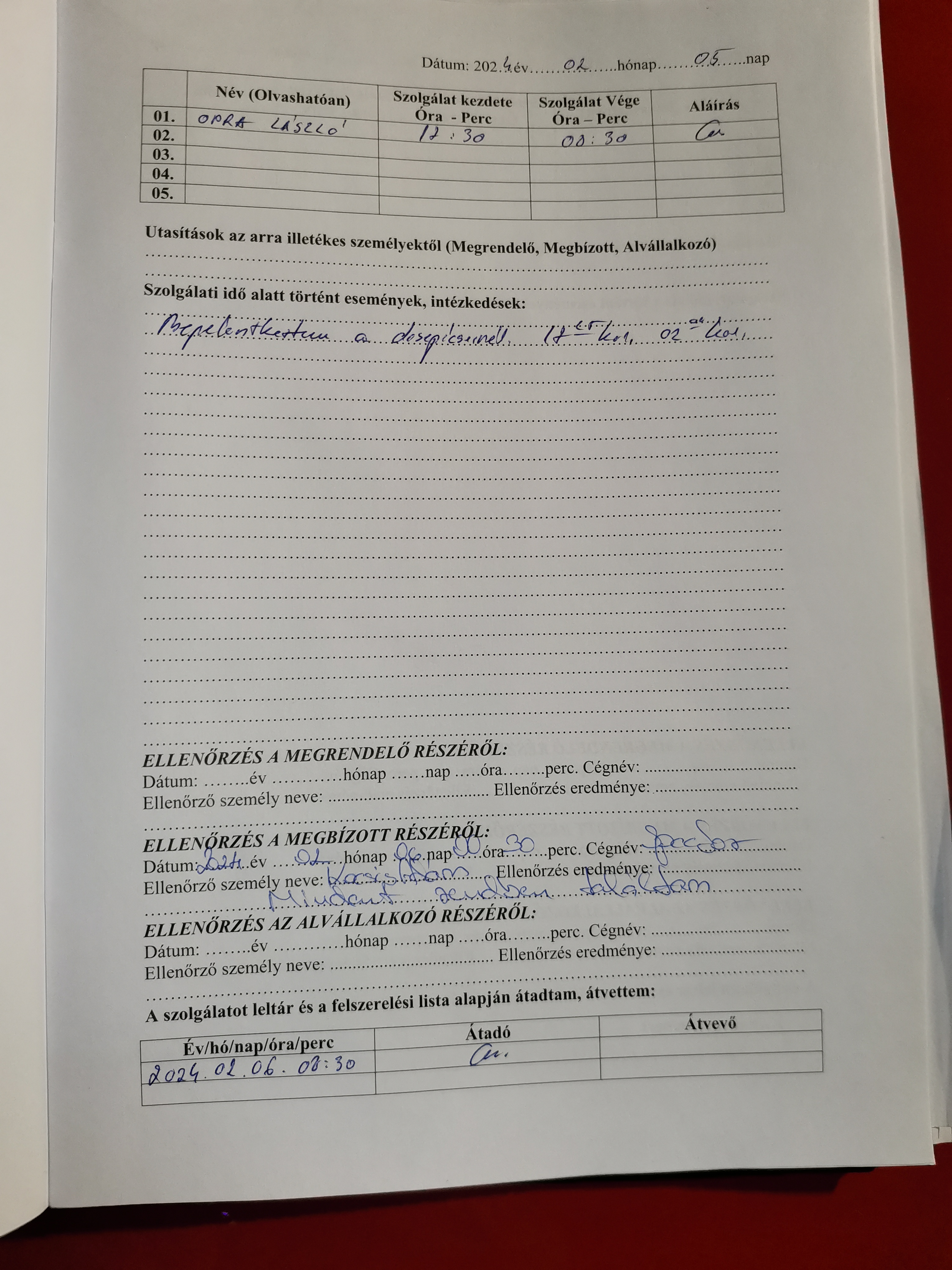 | Az őrzési helyre kiadott munkaeszközök megléte | Megfelel |