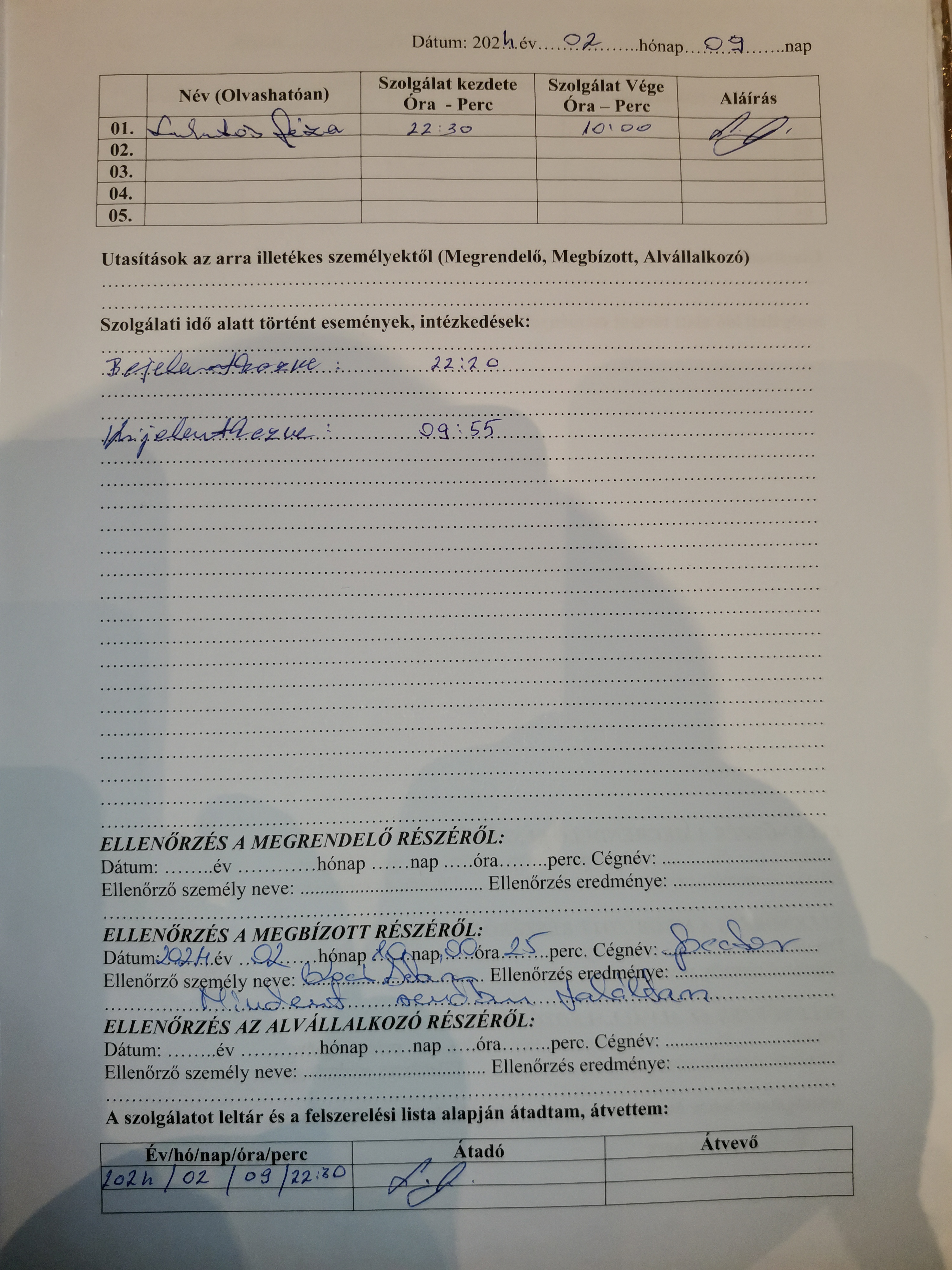 | Az őrzési helyre kiadott munkaeszközök megléte | Megfelel |