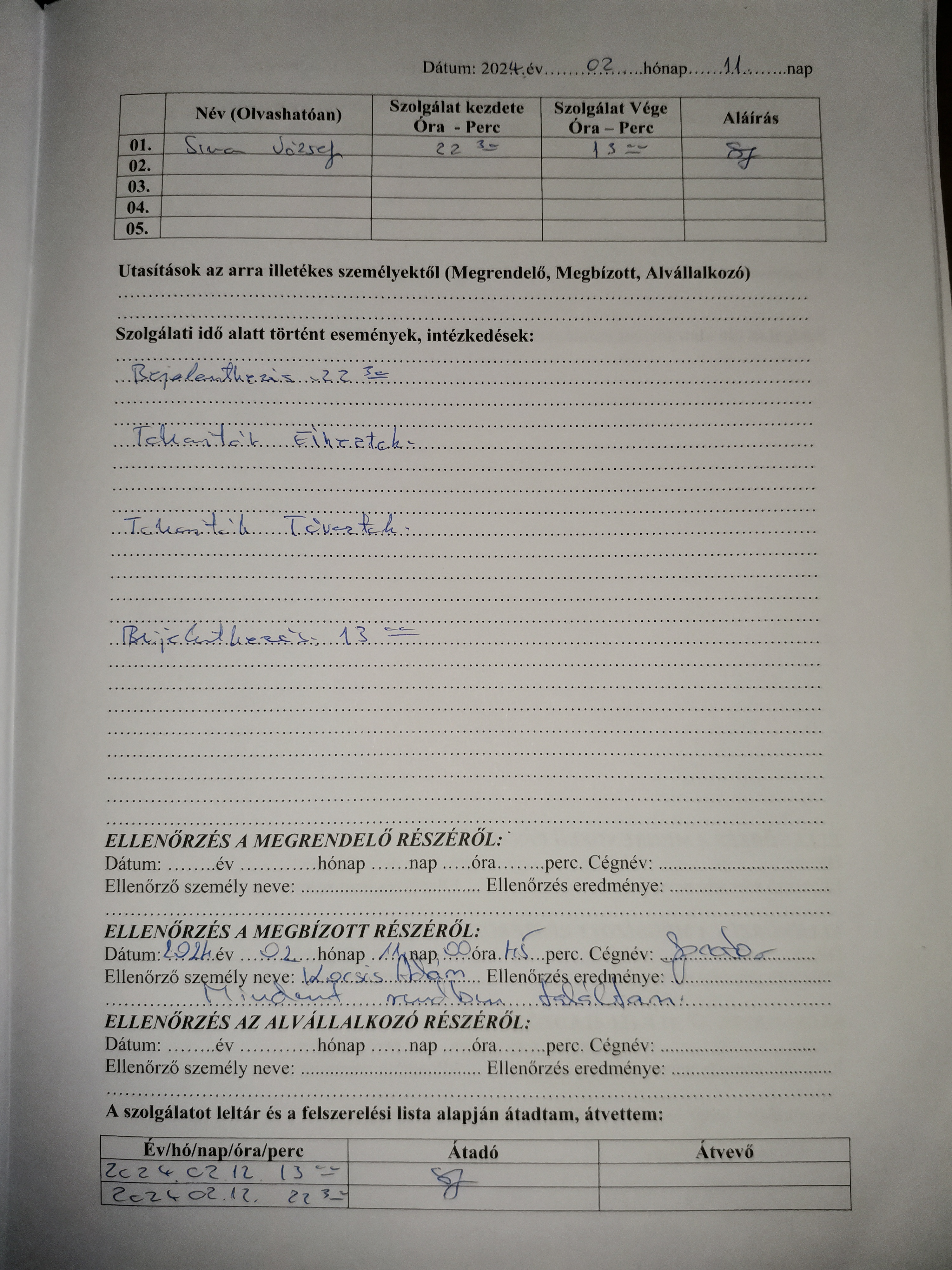 | Az őrzési helyre kiadott munkaeszközök megléte | Megfelel |