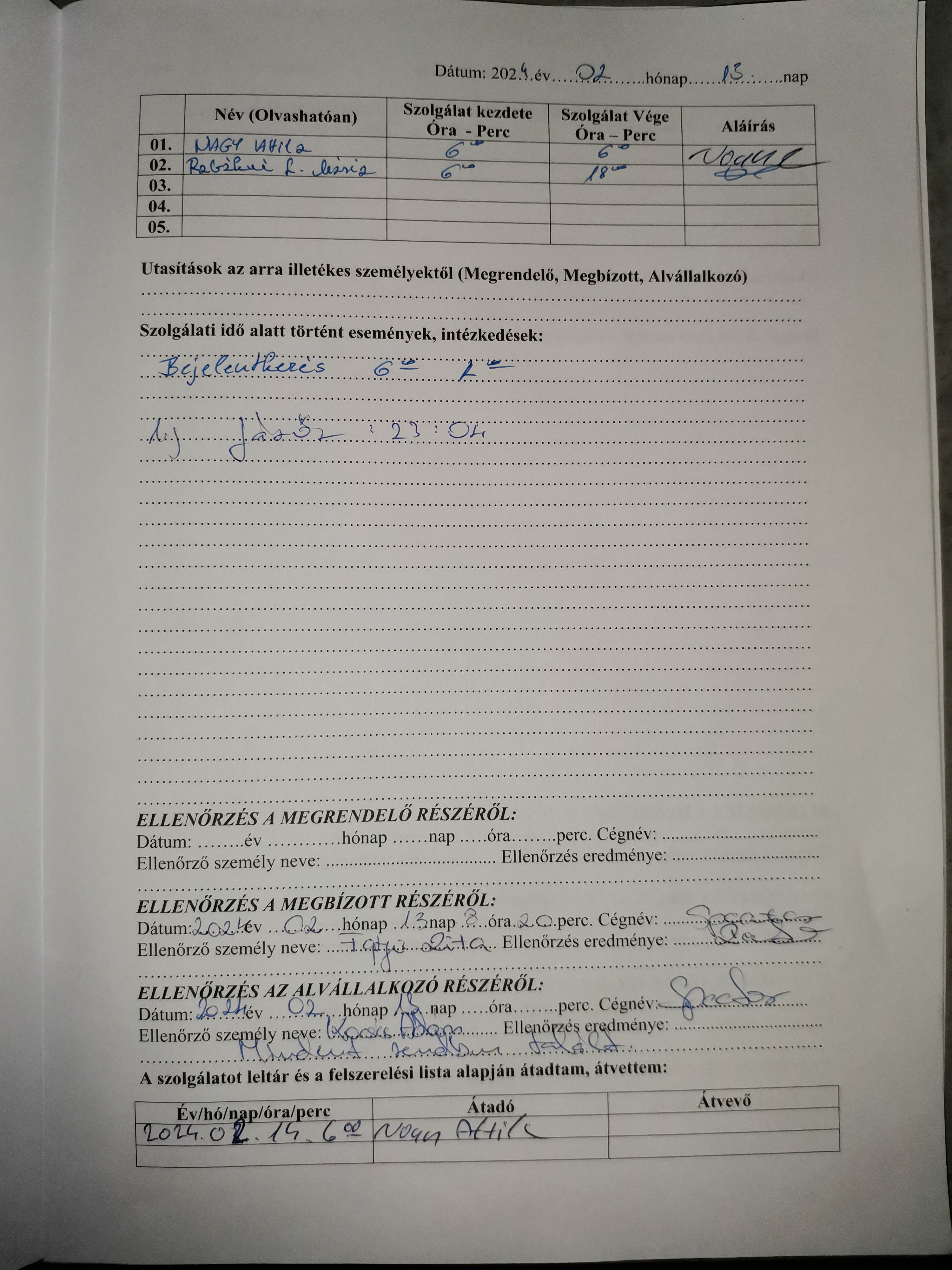 | Az őrzési helyre kiadott munkaeszközök megléte | Megfelel |