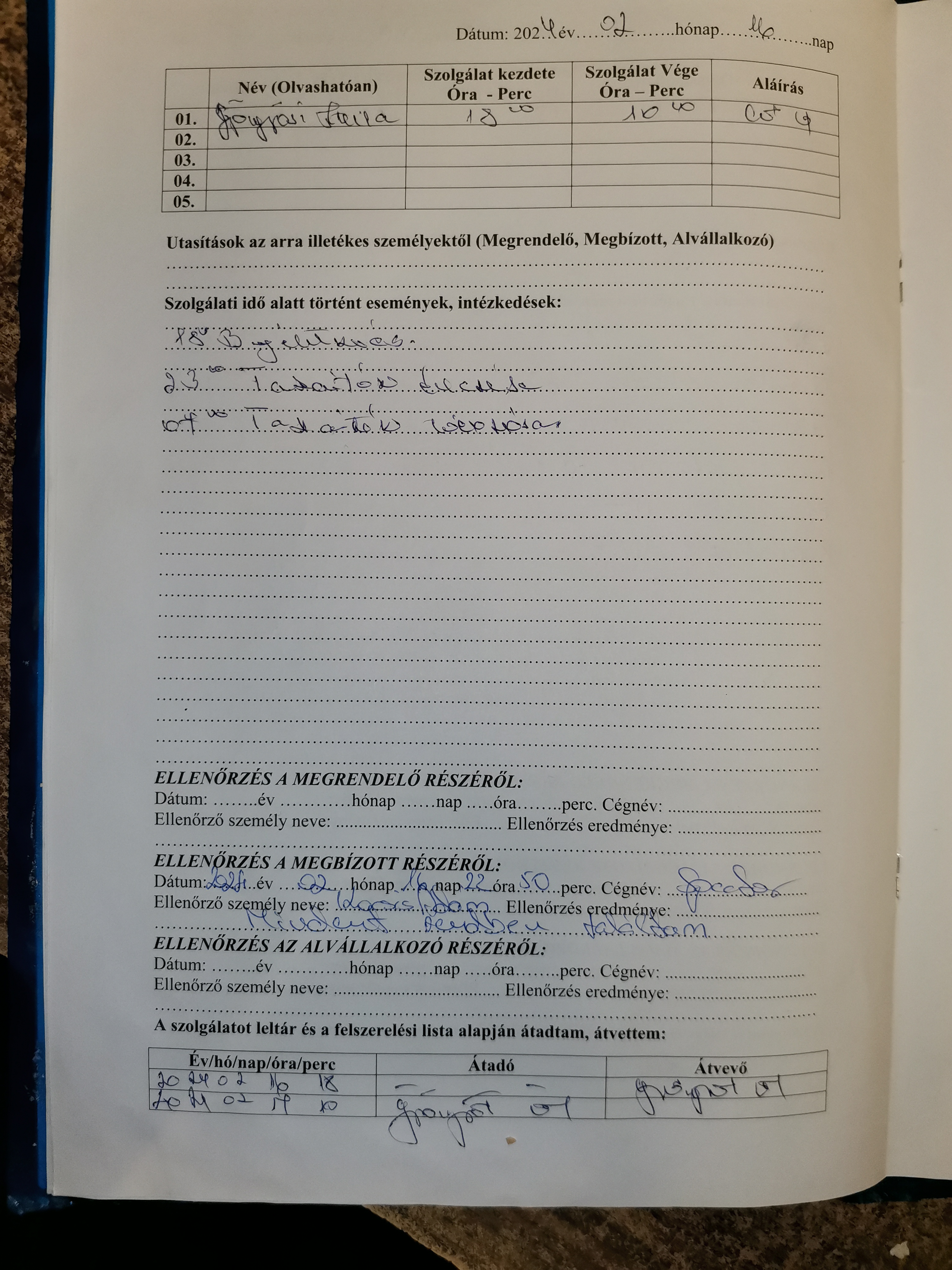 | Az őrzési helyre kiadott munkaeszközök megléte | Megfelel |