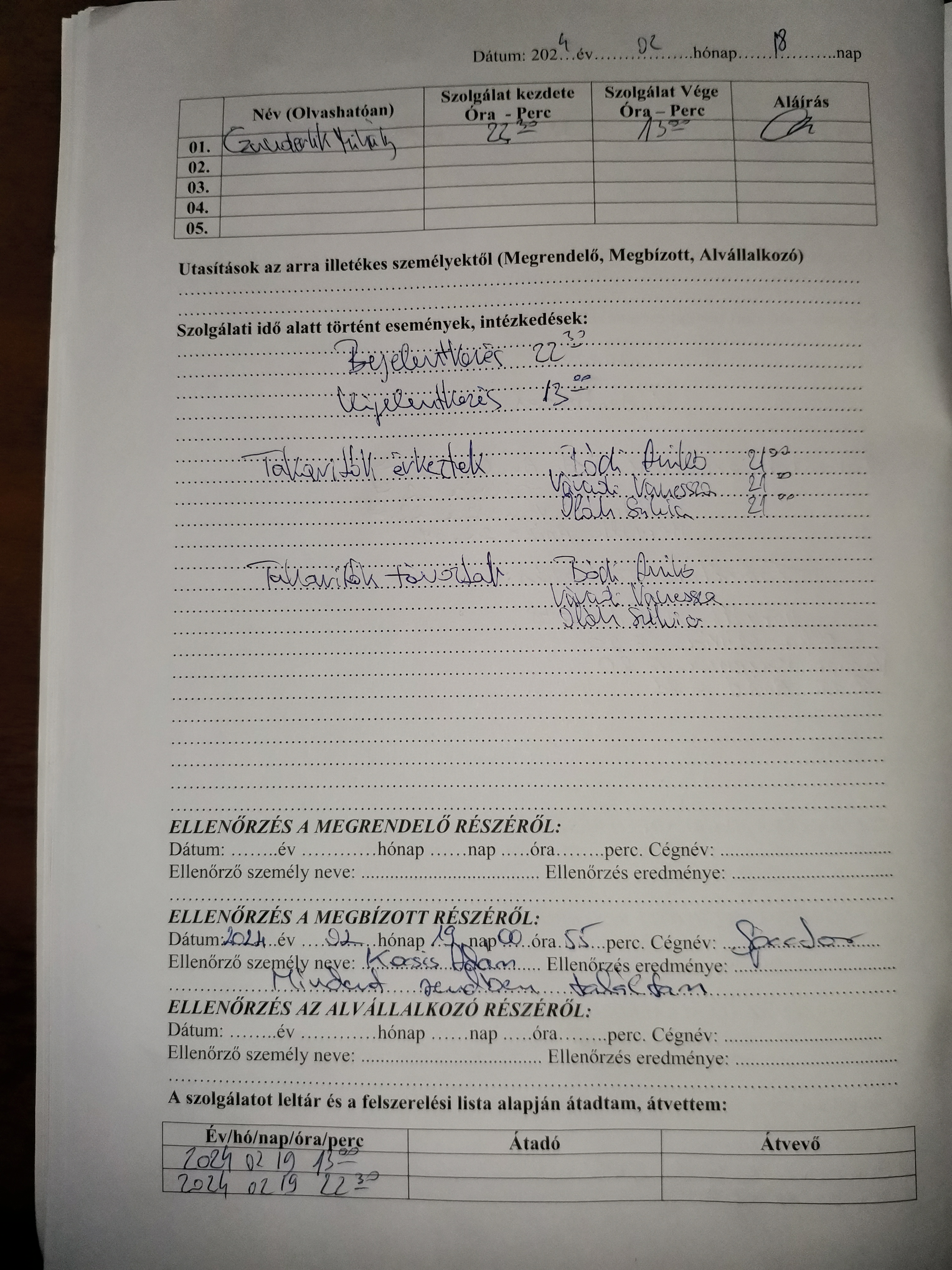 | Az őrzési helyre kiadott munkaeszközök megléte | Megfelel |