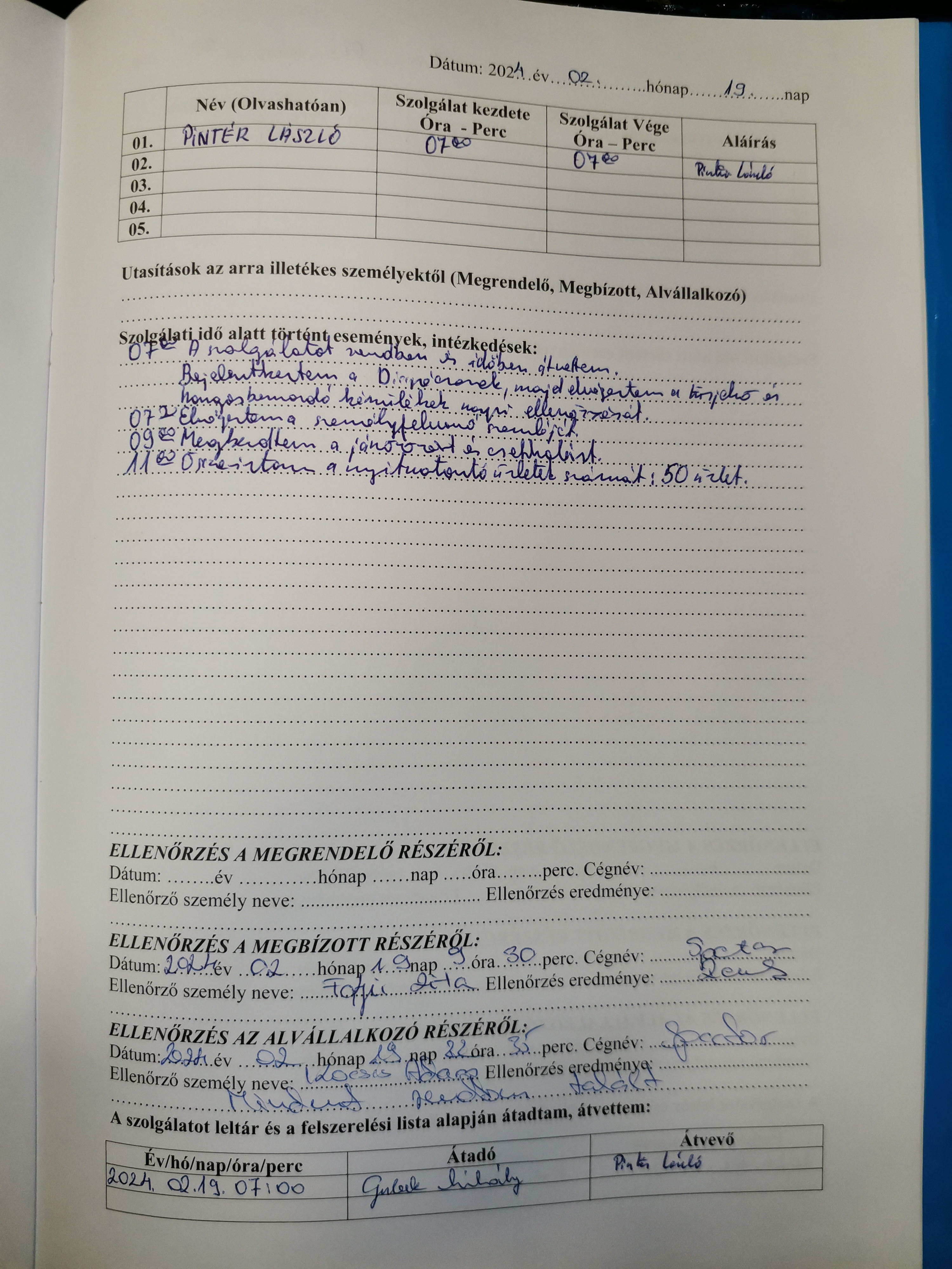 | Az őrzési helyre kiadott munkaeszközök megléte | Megfelel |