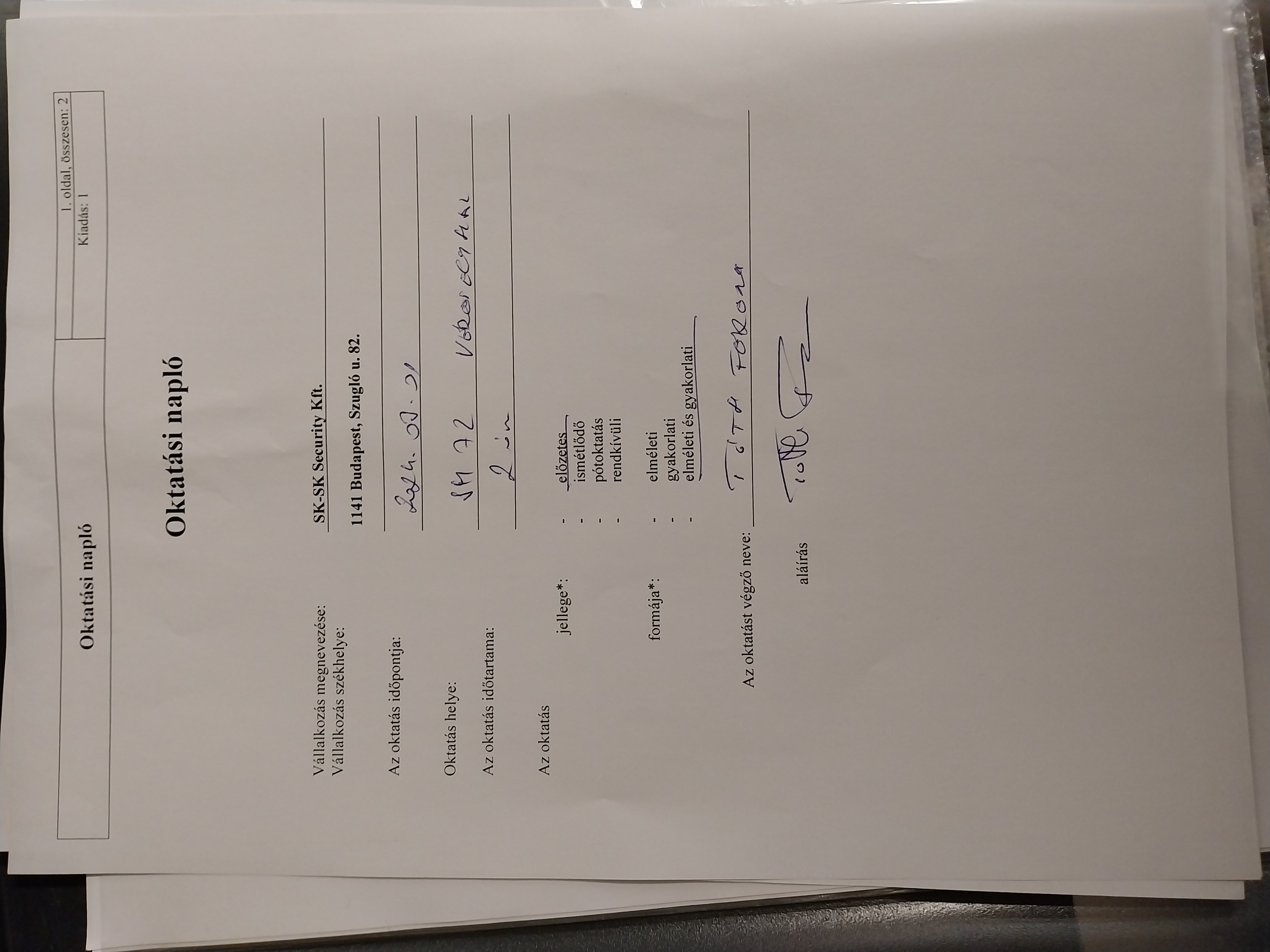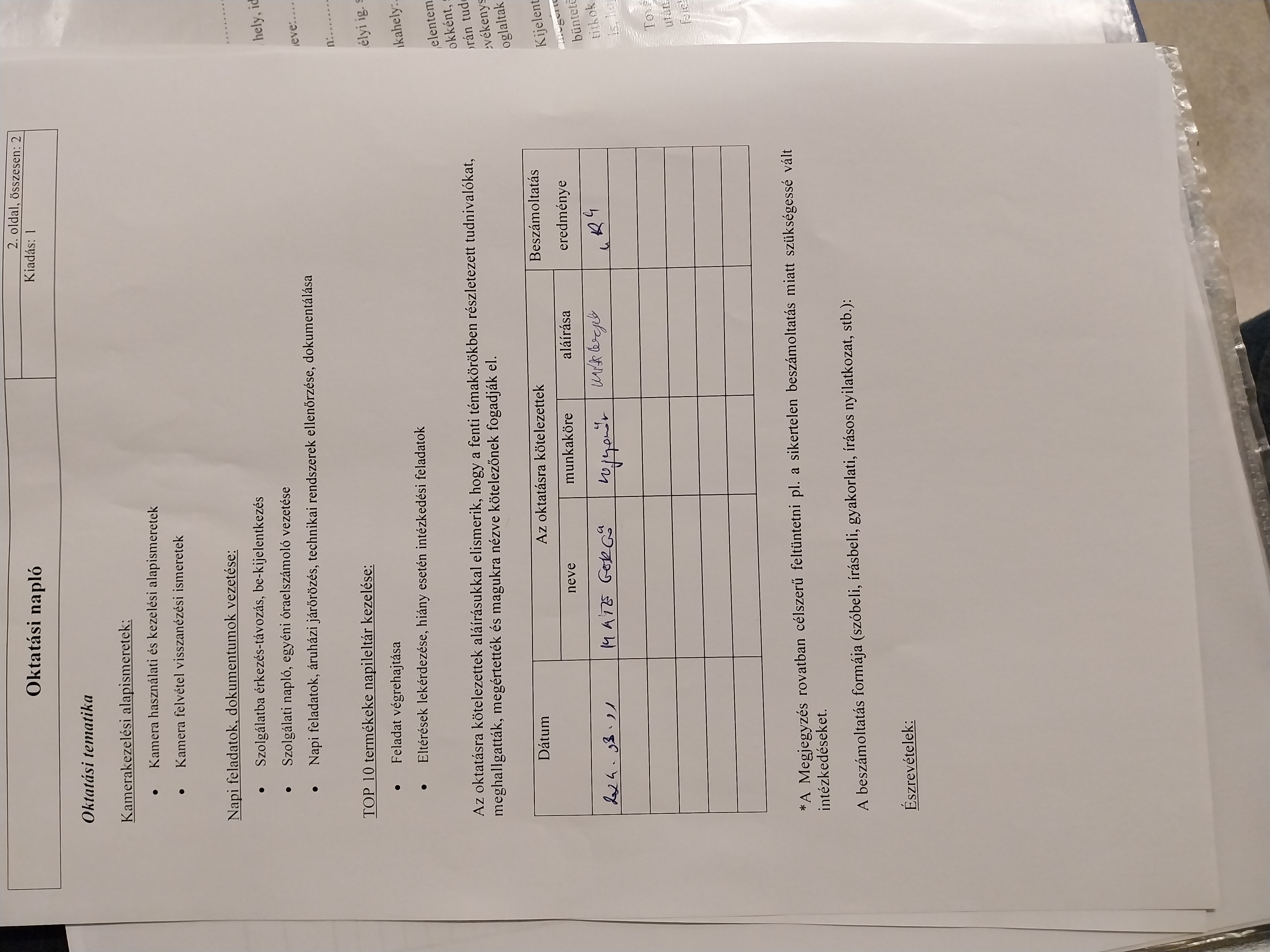 | Az oktatás tartalmának részletezése | Első szolgálatot nap, Alap oktatás ( kamera kezelés dokumentumok kezelés, intézkedések.m, be- kijelentkezes. |