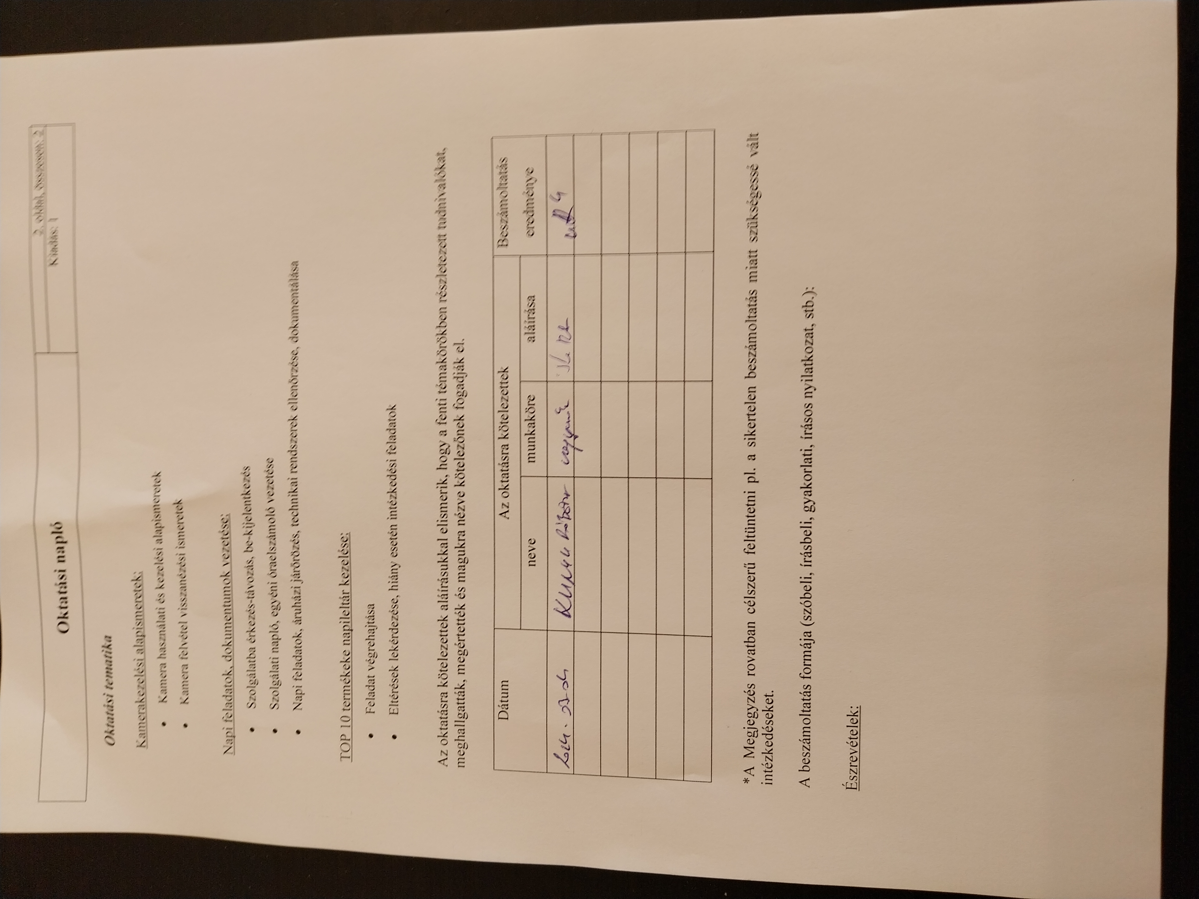 | Munkafeladatok nemmegfelelősége | Első munkanap Alap oktatás megtörtént ( kamera kezelés dokumentumok kitoltese napi feladatok intezkedesek |